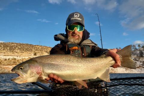 Slid the kayak down the snowy shore and got out for a few hours this afternoon. Hadn’t been on the home lake in a bit. Air temp was 35F with a few flurries and water surface temp was 47F. Baitfish are consolidating. Found a few bigger fish, still fairly deep. Landed a couple of nice 23” cutbows, and one smaller rainbow. That’s at least the 18th CO master angler qualifying trout I’ve caught on the home lake this year (plus at least 3 MA walleye and a handful of MA bass. Not bragging, just keeping track here for myself since I’m not submitting them).