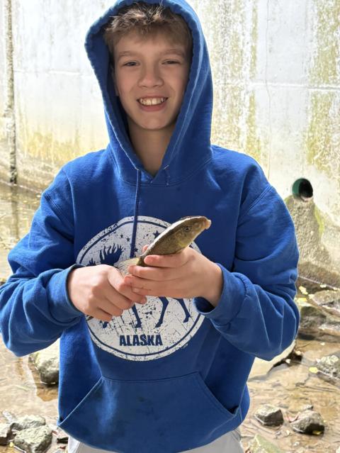 Romp at rouge gave me no steelies, but a surprising little sucker had a taste for the Pat's rubber legs. Saw a steelie hiding in driftwood, and a tiny pike.