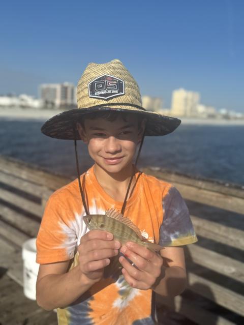 Approximate length 3'. At the very end of the pier. One hour after slack low. Uglystik GX2 spinner, 40lb mono. Double drop shot, 3oz pyramid sinker, 3/0 octopus circle hook, 2/0 circle hook. Caught on the 2/0. Whole frozen shrimp chunk.