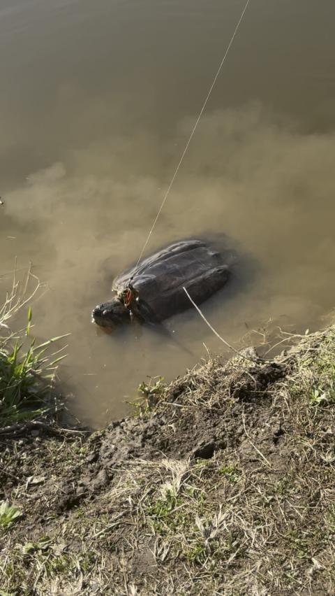 Well, I was using a red and green jig with a rage crawl trailer as you can see and I snagged probably a 30 pound snapping turtle… all by myself, so I just had to snap it off.