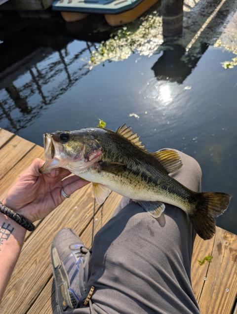 Fishing in a new spot, going after the big fish I saw on multiple days of scouting the area. I'm not sure this is the exact fish, but I'm not complaining either! This was my first time trying a drop-shot rig, too. The fish here are very finicky, they've never bit any other bait I've thrown in the spot.