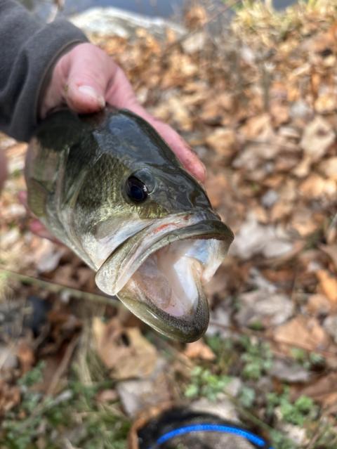 First catch of the year during a quick stop at a local pond, a little unconventional with a fly rod, barbless hook and red worm