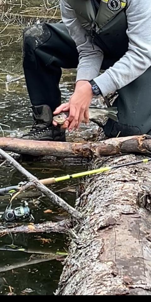 Saw about 20 fish, 15 trout 5 perch got 8 bites and 2 fish. A fun day. Had to make holes in the ice with logs so we could fish lol.