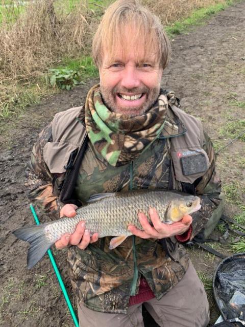 Not my catch today but my fishing buddy. River Chelmer in Essex. I had no fish and not even a bite. Nigel had one fish this 5 lob Chubb. On bread.
