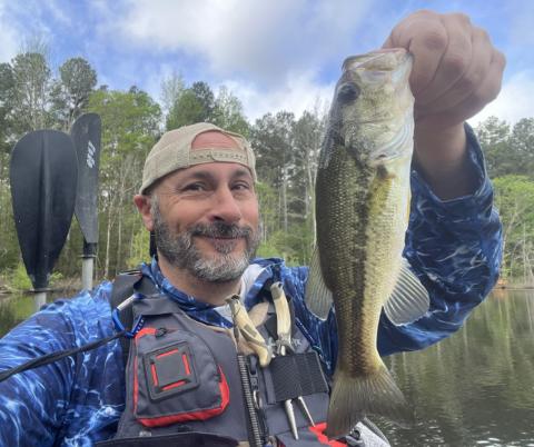 Son caught this bluegill from the kayak (using a soft plastic lizard) on a private Alabama pond.