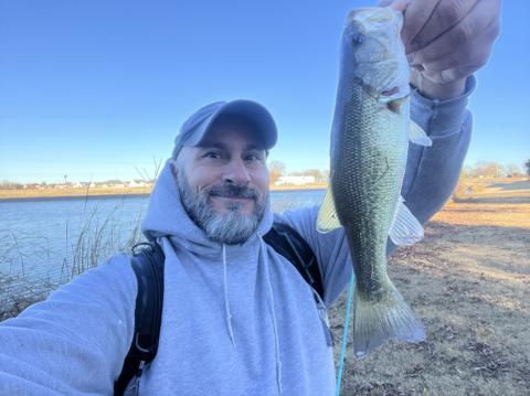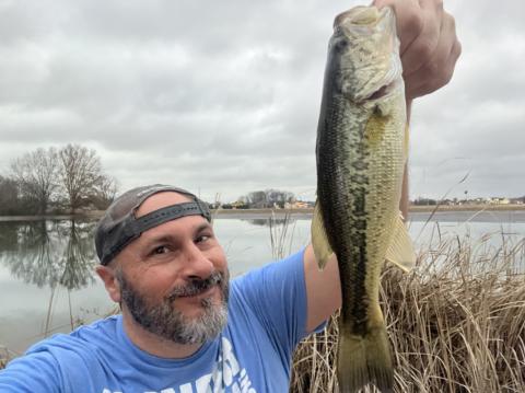 On a day when the Bass Forecast app said fishing was only a 1.9, I caught five LMBs. I caught this one from the bank of an Alabama pond using a weightless soft plastic worm (black body, chartreuse tail).