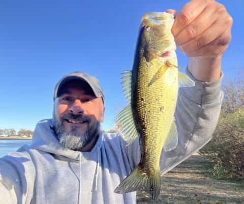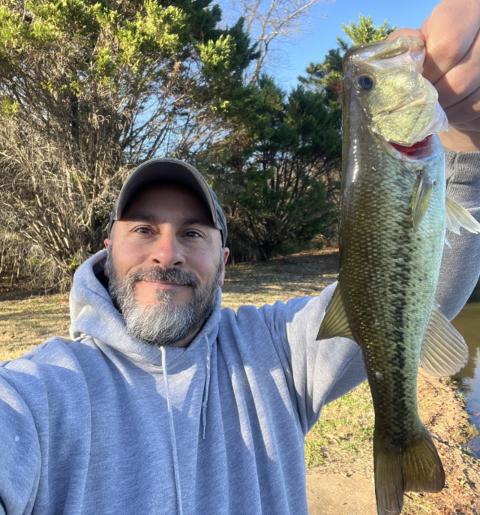 2 of 3: Took advantage of this week’s warmer temps to bass hunt. Caught my second LMB from the shore of this Alabama pond using the four-inch Yum dinger on a wacky rig.