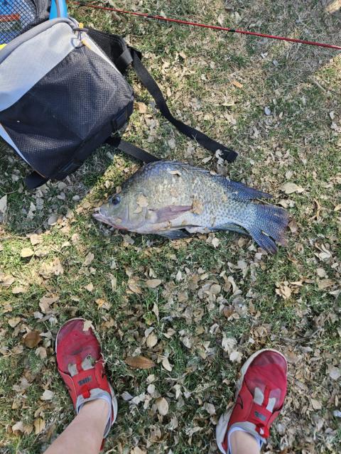 Believe this is a Talapia, not Blue gill. Caught on a garlic night crawler