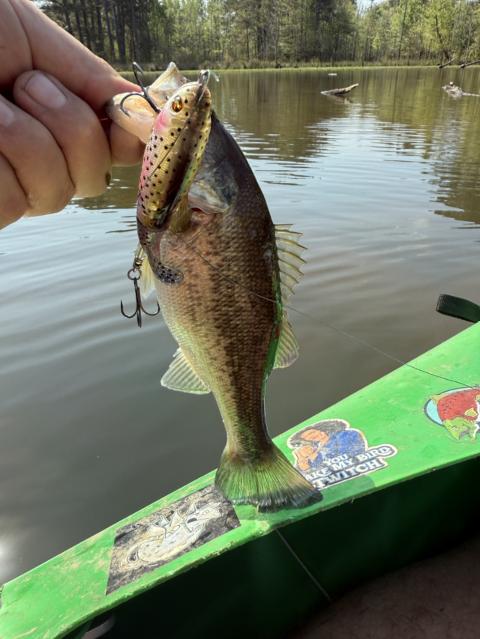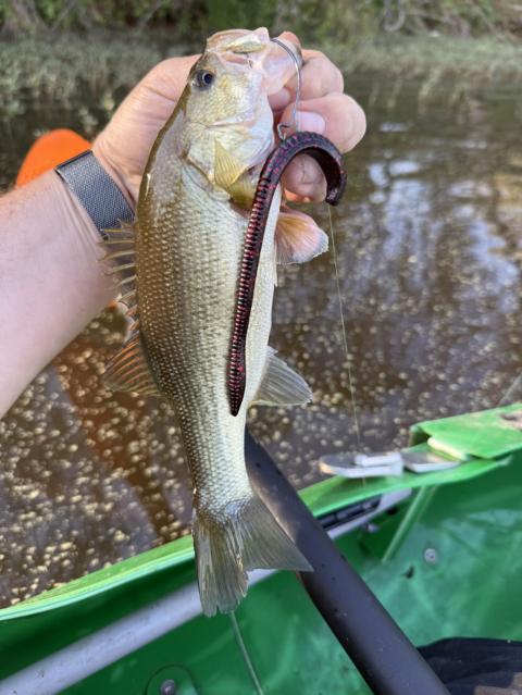 Black red glitter trick worm. This guy snapped at my plopper and missed so I switched to the worm quick and got him on the second cast.