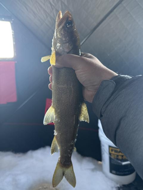 On the board with our first catch of the Schoodic Lake Ice Fishing Derby