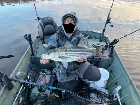 Got out at first light with my buddy. We landed 3. Two Wipers for him, 7+lbers and a 8lb Pure for me. They were more active when the air temp was below freezing with no wind. Temps rose onto the 40's with the wind picking up. Only a few smallies after that.