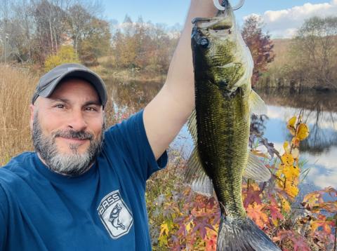Stout little one-pound, one-ounce LMB caught from the shore of a private Tennessee pond (on a picturesque golden fall afternoon) using a weightless Googan Bandito Bug.