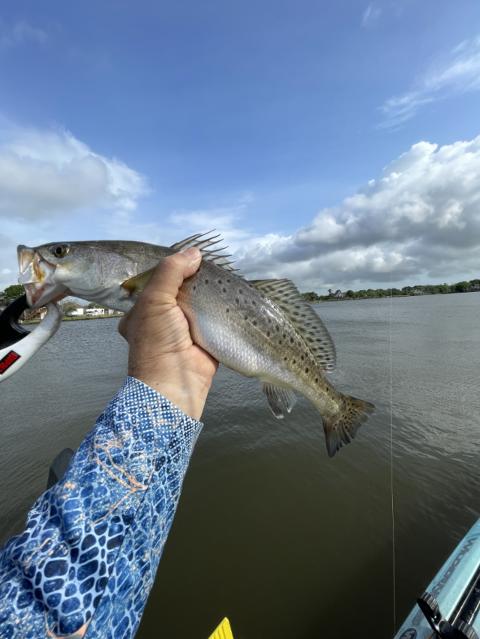 Only fish in the boat. A couple of flounder bit but let loose. I did hook what I think was a gar. It rammed the kayak then went under the boat and the line caught on my electric drive. It pulled me backwards until I cut the line. uudowDickinBayou