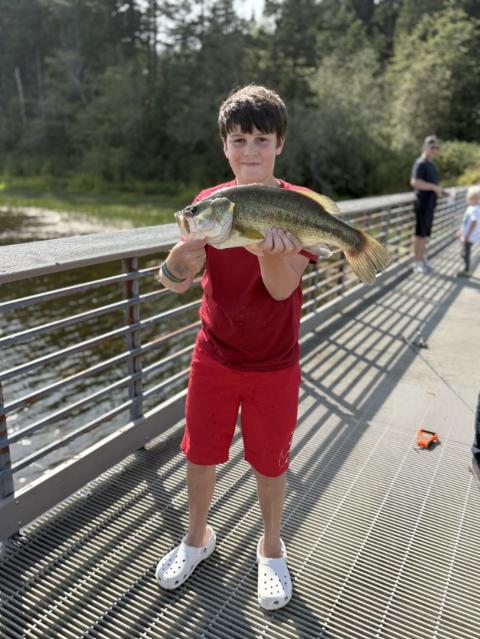 Pb largie!!! 4 pounds 21 inches. I spotted him in the weeds while I was walking to the end of the dock and then dropped down a senko that my mom found right on him and he slurped it up.
