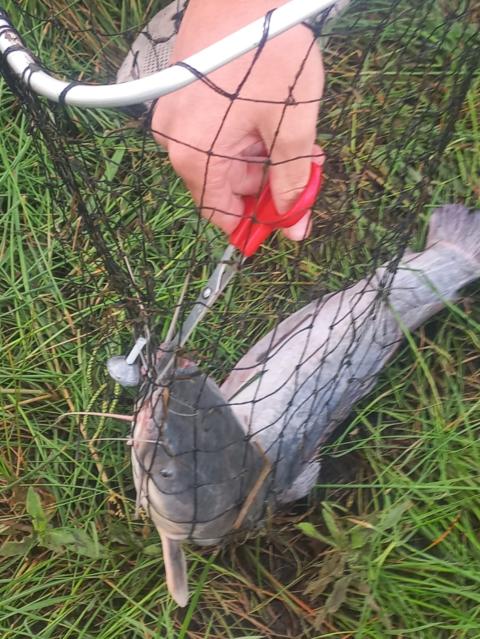 Used an old red grubber lead head.. this guy was so over weight… tummy looks like that from swimming in the shallows.. I could not believe it 🙈